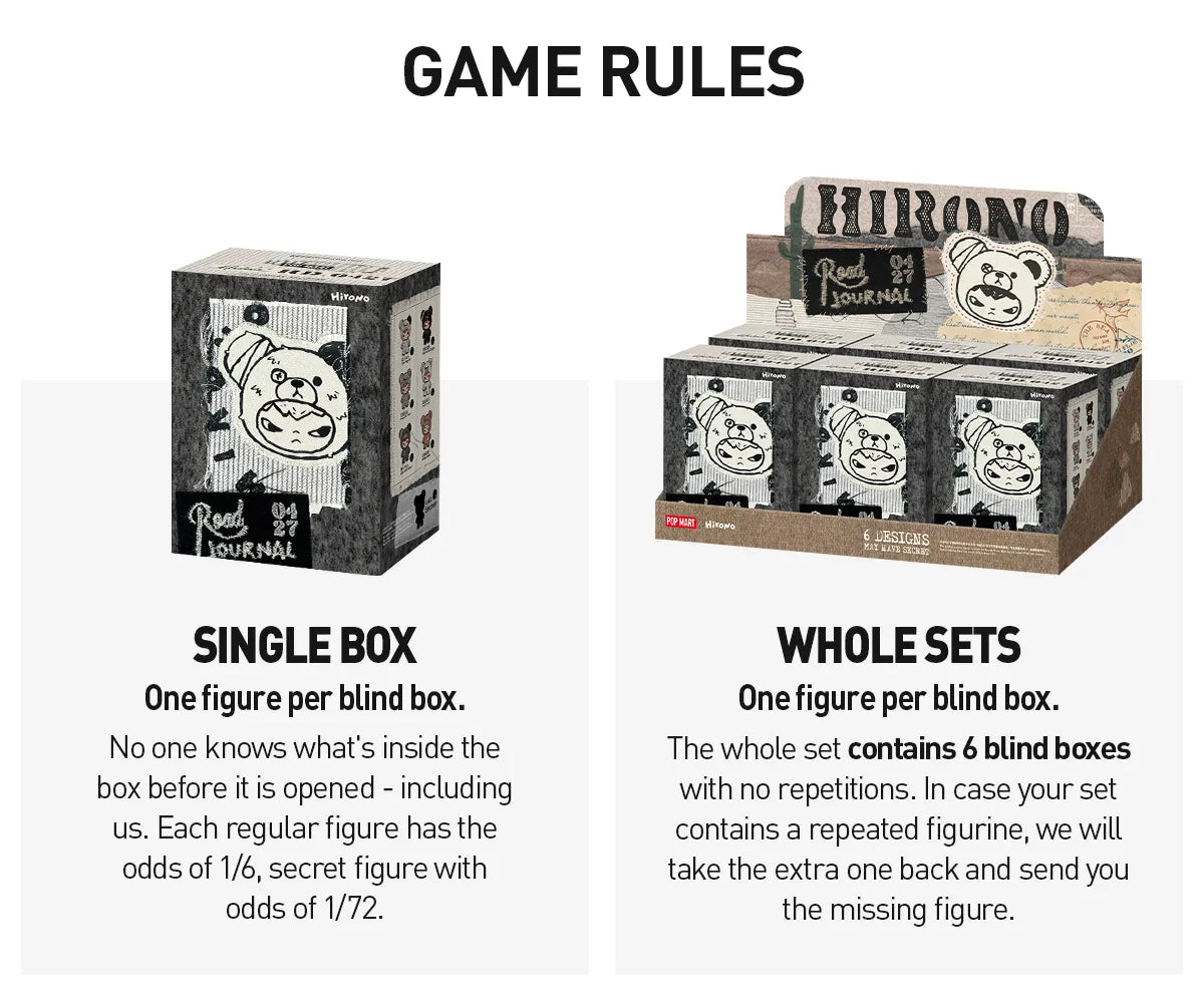 A blind box is a type of packaging that keeps its contents a mystery until it is opened. Designer toy blind boxes typically come in themed series with the entire variety of possible items displayed on the packaging. Some items in a series might be rarer than others. The rarest ones are referred to as “secret”, “hidden” or “chase” items. They are usually not part of the standard 12 box set, and are only identified on the box by their silhouette. One basic edition figurine is replaced at random in sets containing a “secret” figurine.